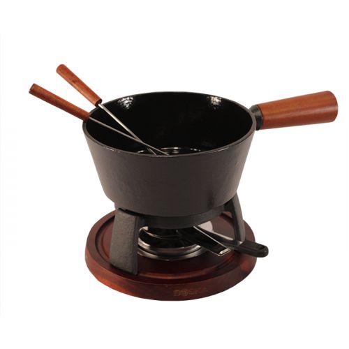 Alles wat u nodig heeft voor een gezellig avondje kaasfonduen. De gietijzeren fonduepan is geschikt voor het fornuis en biedt genoeg ruimte voor 1 liter gesmolten kaas.
