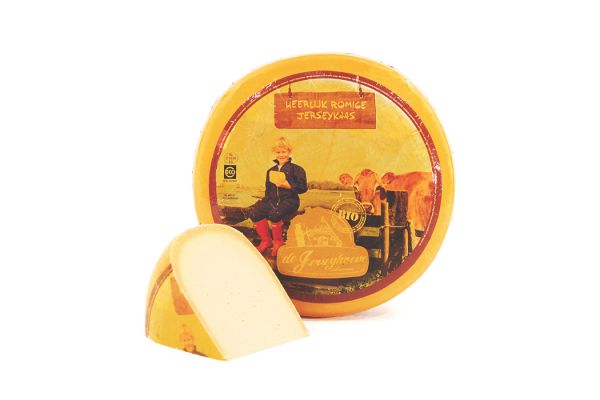 Jerseykaas, heerlijke biologische kaas gemaakt van melk van de Jerseykoe. Heerlijk vol romig van smaak. Onze hele kazen worden minimaal 8 weken gerijpt op traditionele wijze.