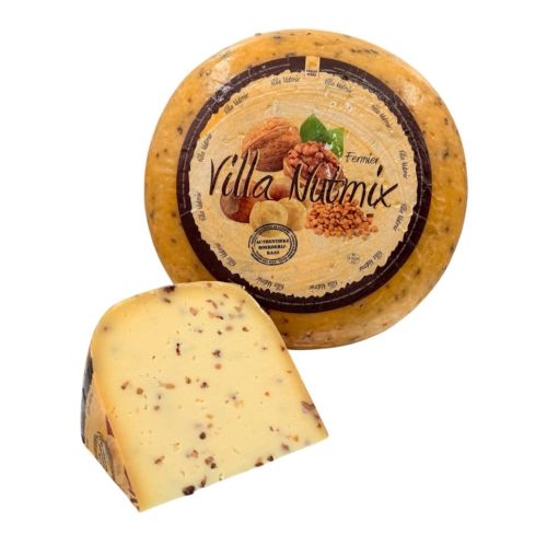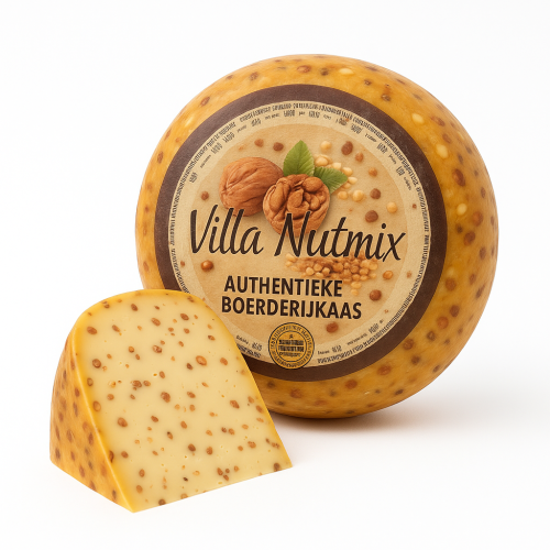 Villa Nutmix is een romige boerenkaas, rechtstreeks van de boerderij. De mix van walnoot, hazelnoot en fenegriek geeft een volle, nootachtige smaak. Zacht, smeuïg en geliefd bij iedereen. Gerijpt gedurende 8 weken.
